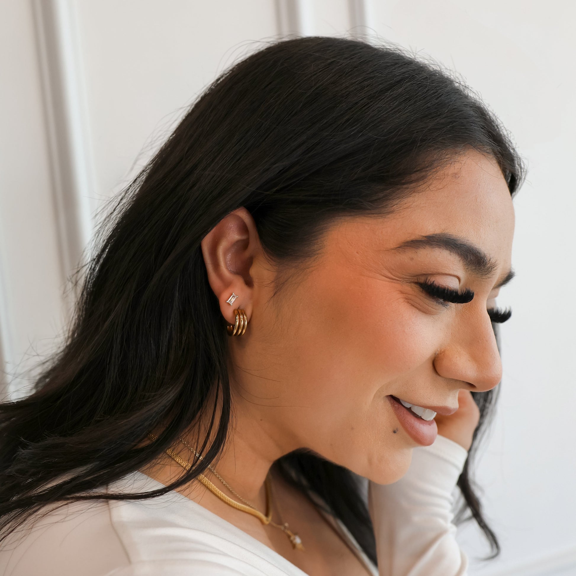 The Abbie earrings are a fan favorite for a reason. With their sleek baguette-cut stone and timeless sparkle, they’re the kind of piece you’ll reach for on repeat. Style them with your go-to jeans for an effortlessly cool look.
