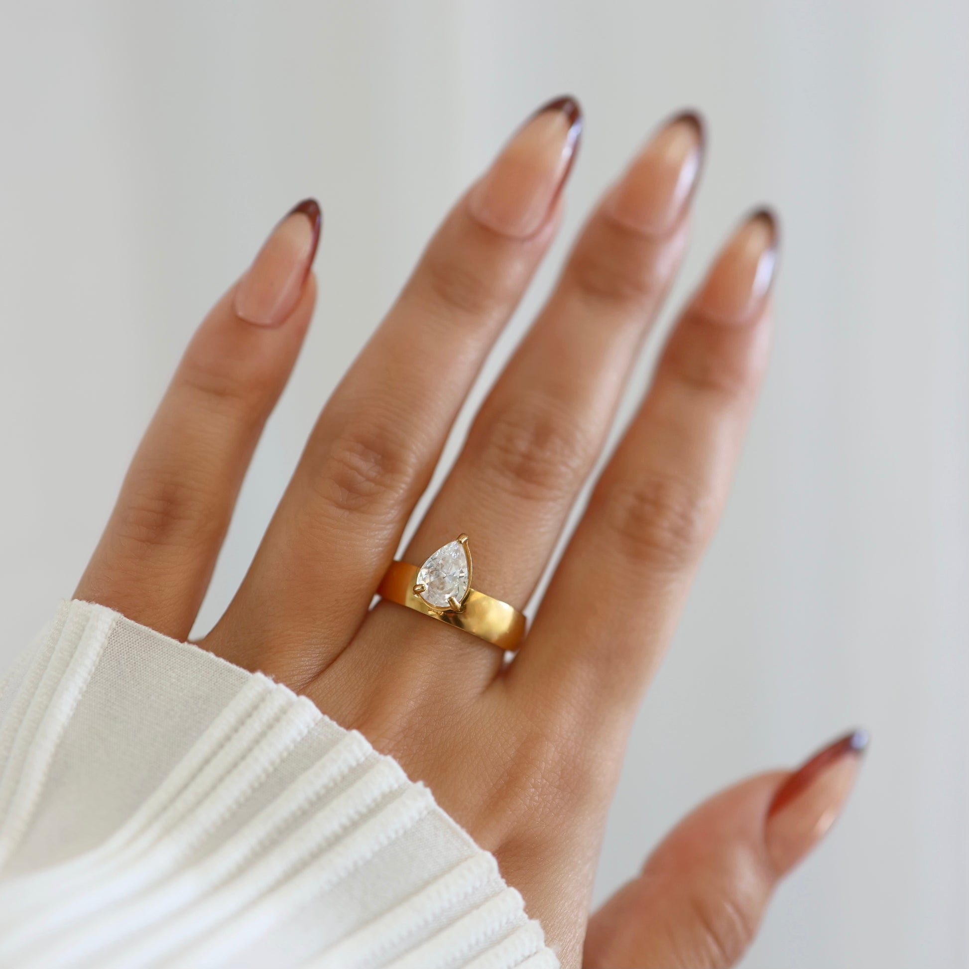 The Alyssa ring is the perfect blend of fun and elegance. We're obsessed with the gorgeous pear shaped stone paired with a simple thick band.