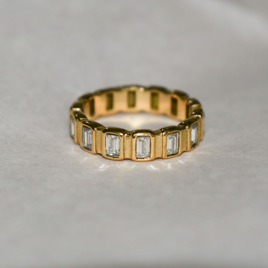 The Ariel ring is a flawless take on a timeless design. It features a gorgeous set of emerald cut CZ stones embellished across the entire band.