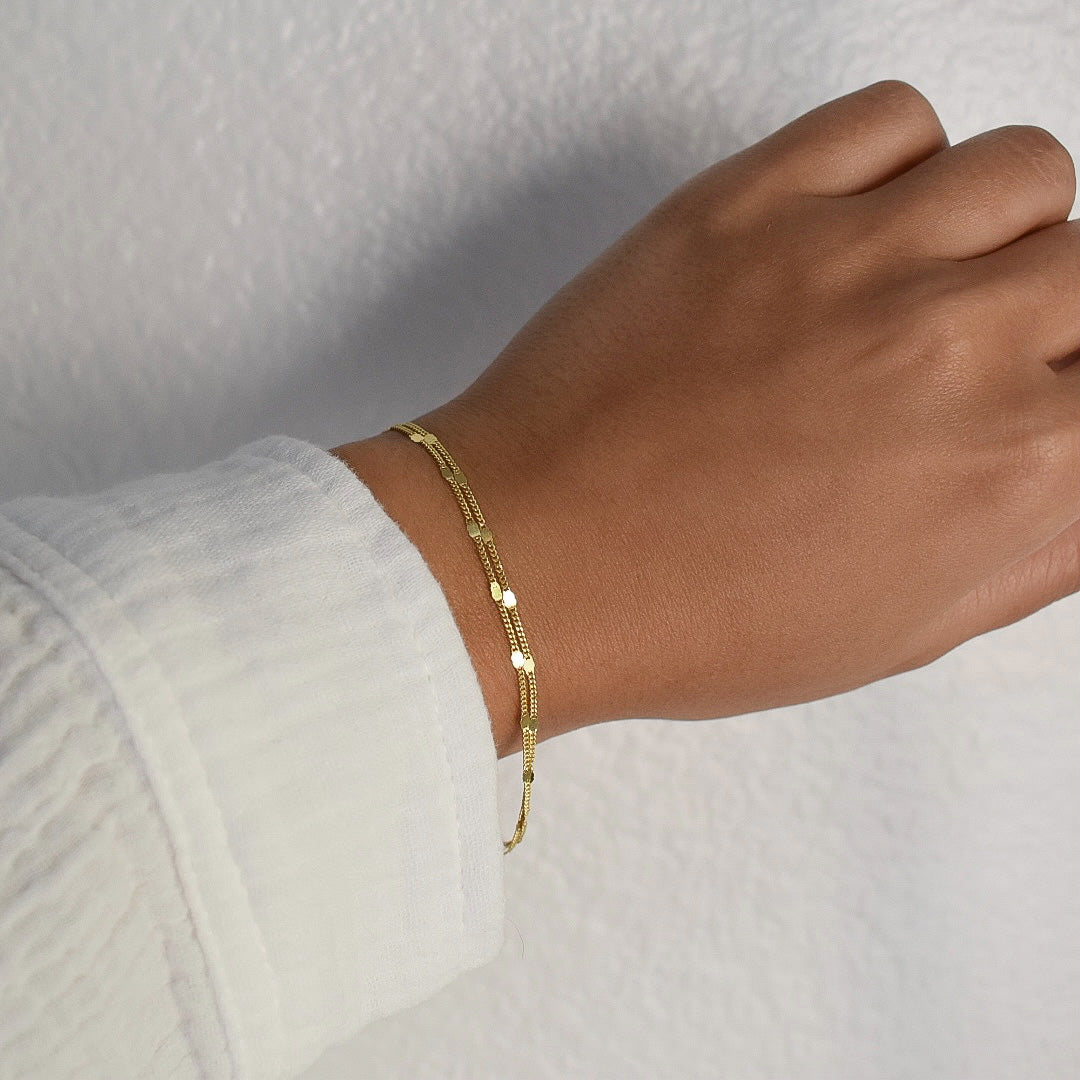The Faye bracelet is an elevated take on your everyday accessory. This dainty double layer bracelet is crafted from a thin chain giving it effortless elegance.
