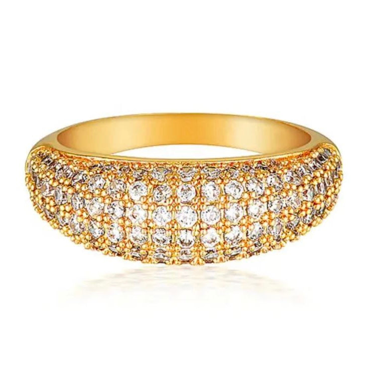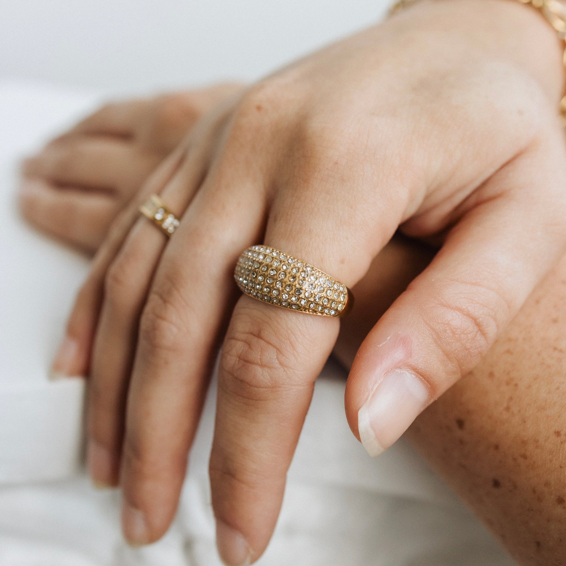 The Melinda ring is pure glam. This jewel encrusted dome design is such a statement piece and sure to turn heads.