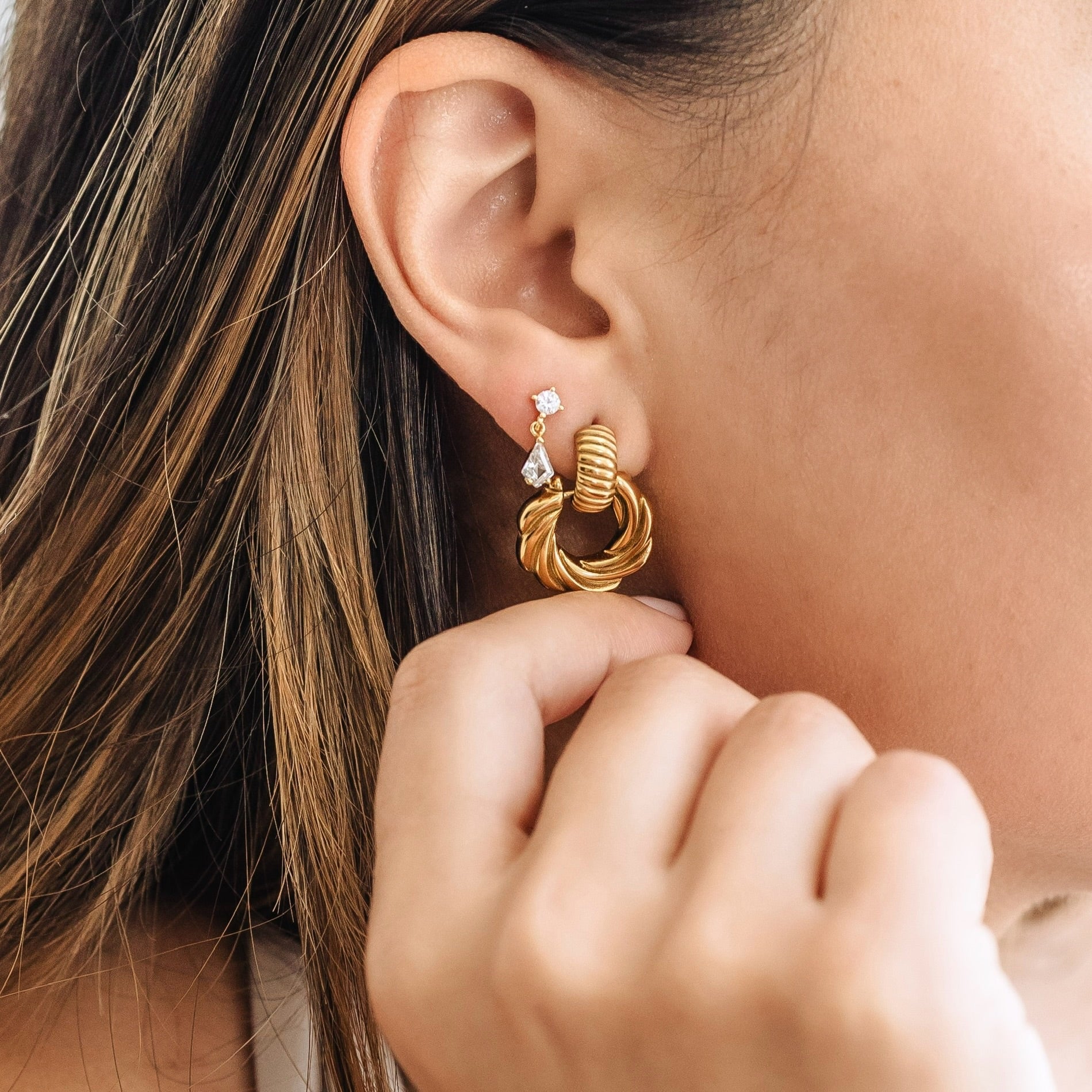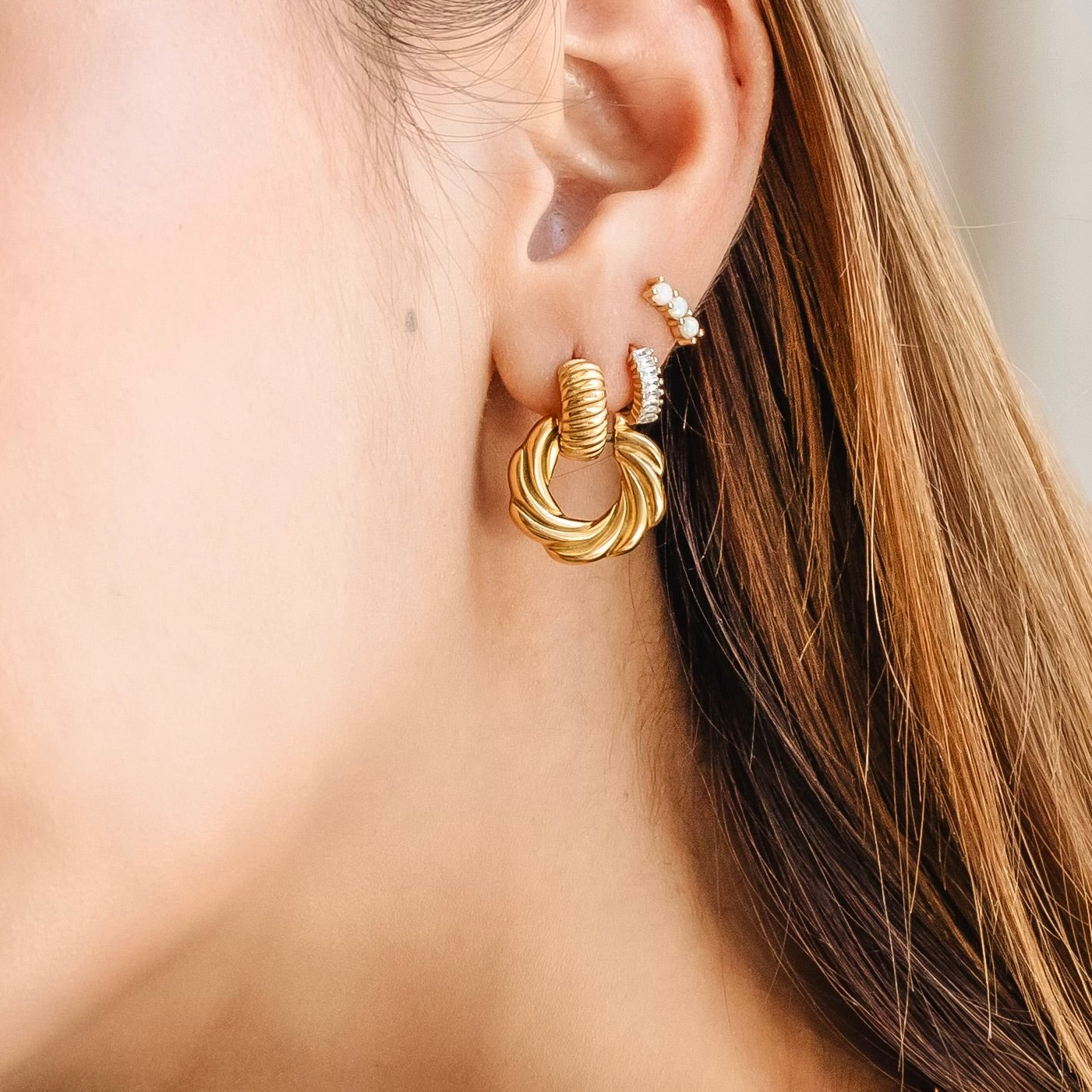 The Ophelia earrings capture the essence of timeless elegance. We are obsessed with the never ending hoop paired with a croissant huggie design. The easiest way to elevate any look.